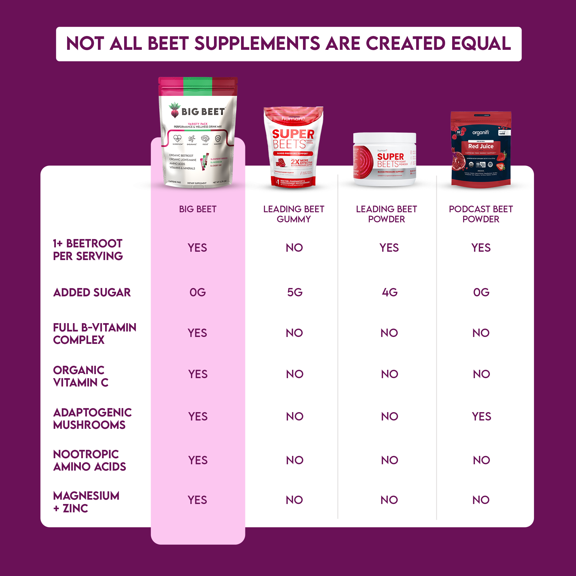 Big Beet has set a new standard in terms of functionality for beetroot powders, and this isn't just another bold marketing claim - Our nutrition label proves it. Big Beet is the first beetroot powder to use organic food source vitamin c and methylated B9/folate, and we're the first beet powder to include brain-boosting nootropics.