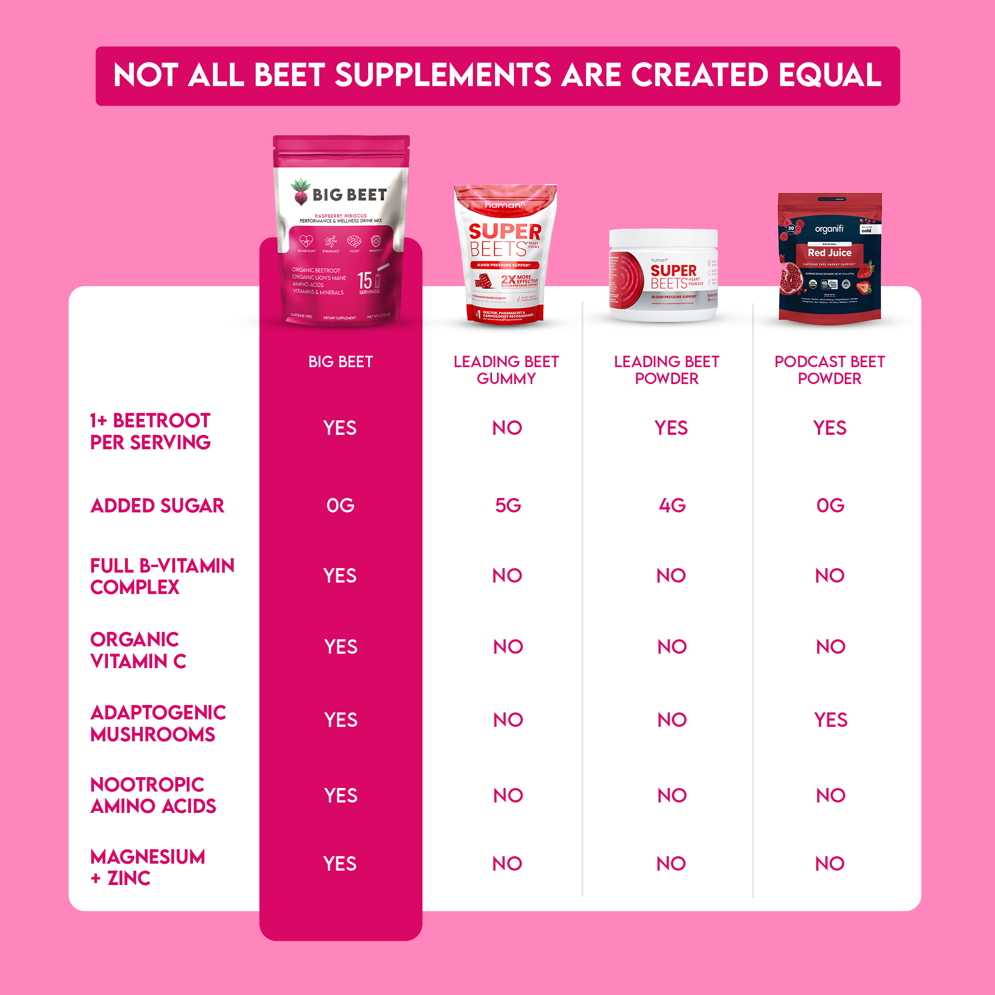 Big Beet is made with organic superfoods like beetroot, lion’s mane mushroom and acerola cherry, natural vitamins & minerals, amino acids, and natural flavors that meet organic standards. Our vitamin C is food sourced, unlike our synthetic competitors. We prioritize quality above profitability, and source all ingredients from trusted suppliers to ensure optimal benefits and safety for our customers.